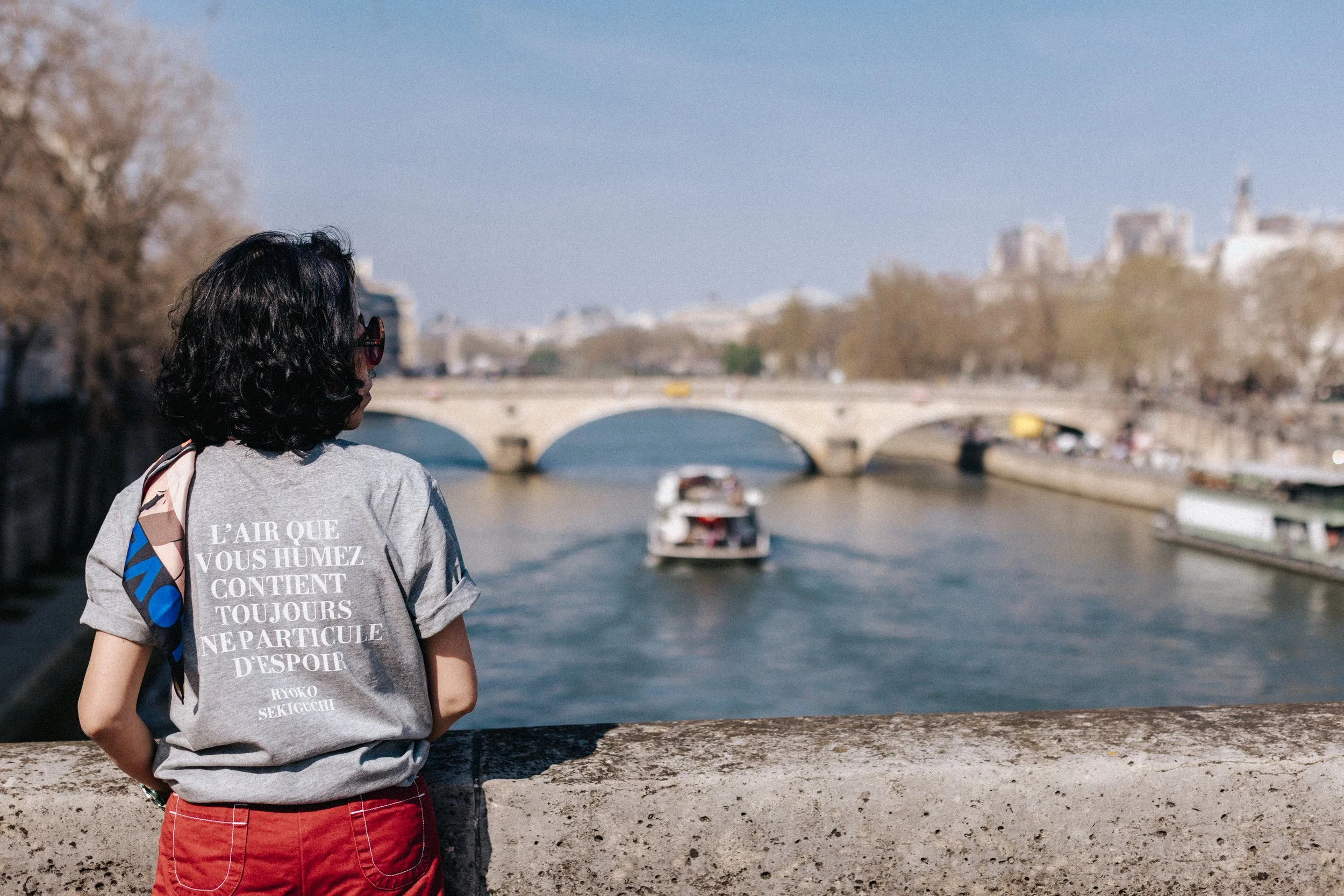 Un t-shirt et un tiré à part parés d’une citation inédite de l’écrivaine et poétesse Ryoko Sekiguchi